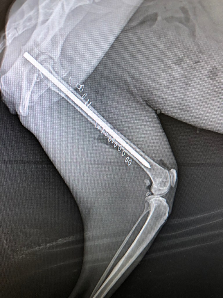 The x-ray confirmed a complete femoral fracture as well as multiple hip fractures and SI luxation. I contacted several veterinarians to ask about orthopedic repair. Unfortunately, the lowest estimate we got was $2000. This is a significant amount of money for a non-profit organization and not something we can do. So I decided to do my best and fix the fracture.