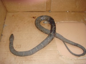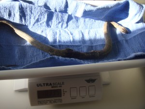 Meet Hermie. He came to me “on emergency” from two very nice ladies who found him by the river bank. It is difficult to see in the photo, but Hermie had a significant laceration that I suspect may have been lawn mower induced. Hermie spent the night on my back porch while I diligently searched for a “How to repair a snake” article (Oddly enough, I did not find one). I called every exotic vet in the area, a veterinary surgeon, and a friend of mine who is a vet in NYC with experience in reptile medicine. I left messages for all and hoped to have some answers quickly.