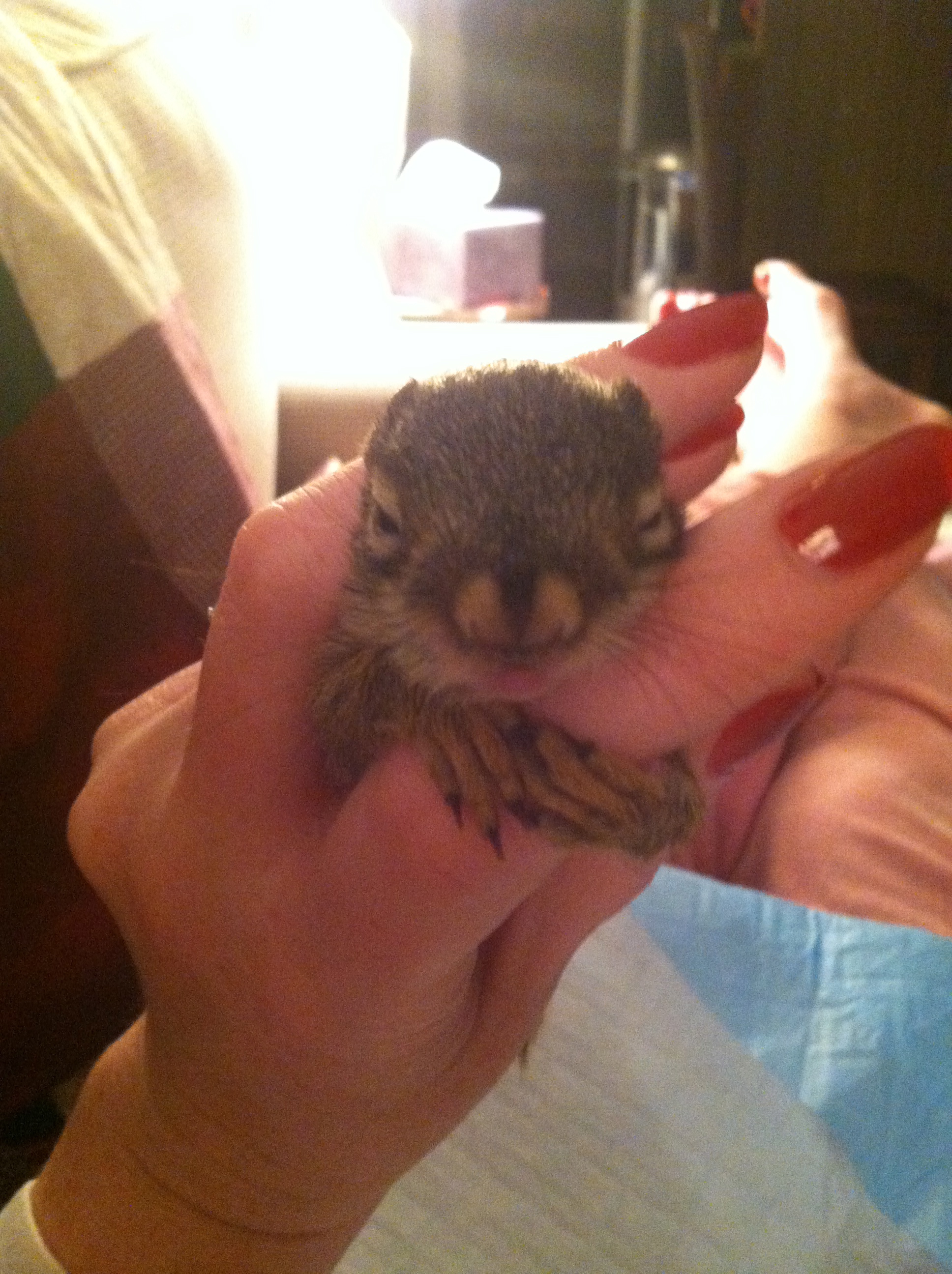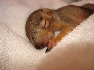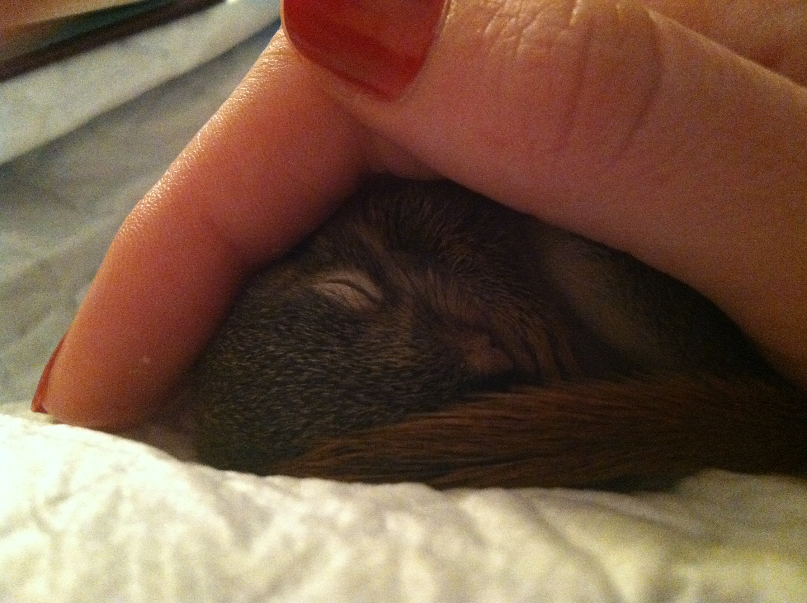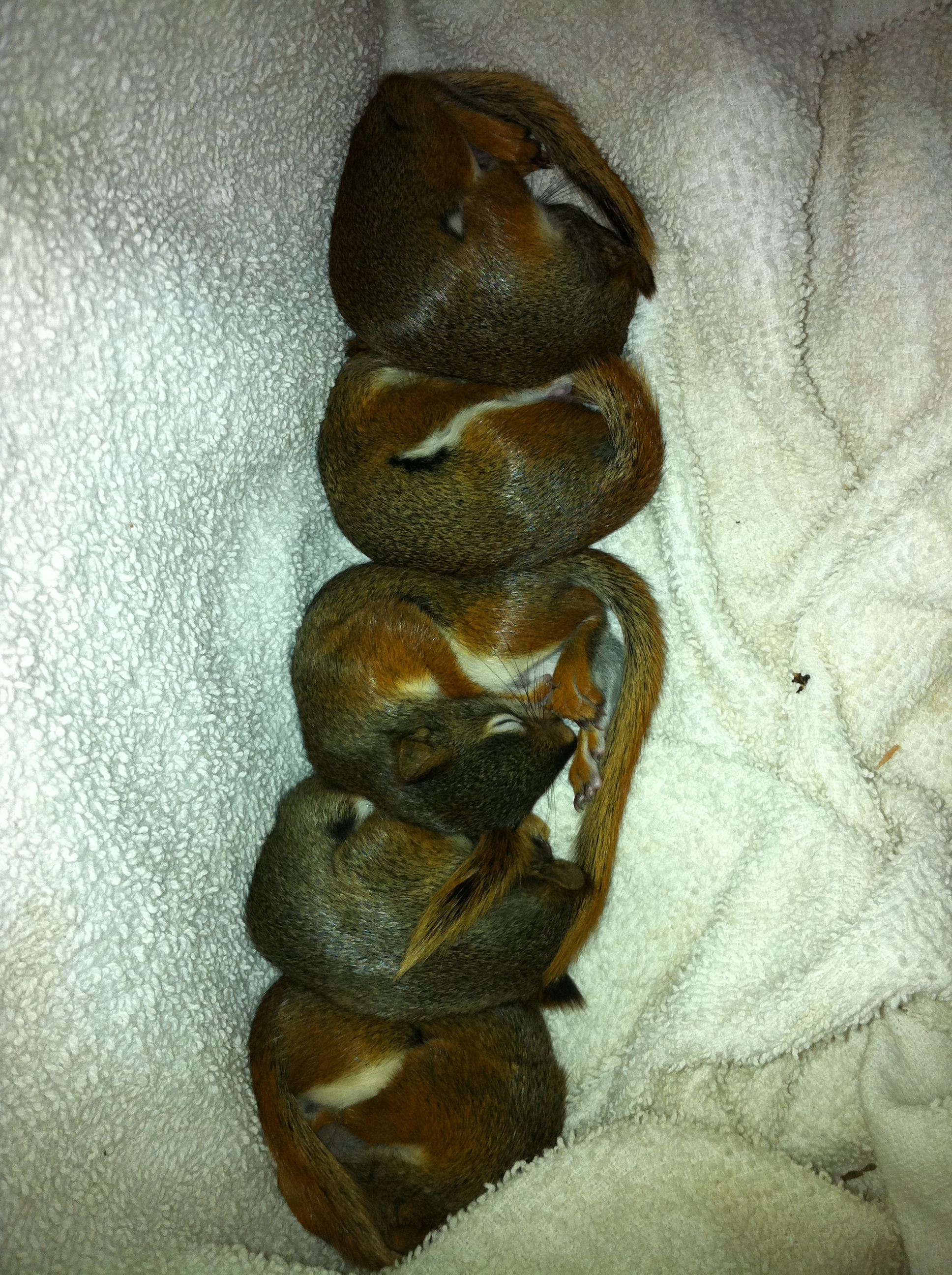 I received an urgent call from a neighbor about a nest of baby squirrels found in the remains of a chopped down tree. My advice: leave the babies covered and warm in the hopes of mommas return. (though secretly, I was hoping for the chance to raise a lot of baby squirrels;) The next day I got another call that they were still there – what to do? “I guess I can take them” I said to the lady who found them (hee hee).