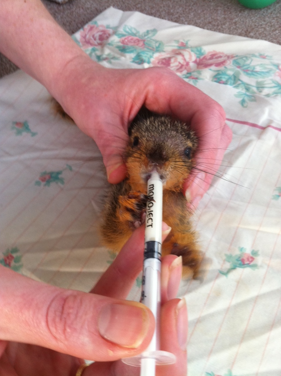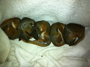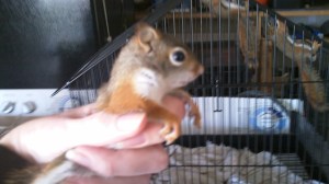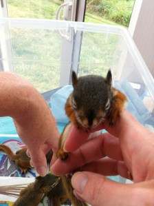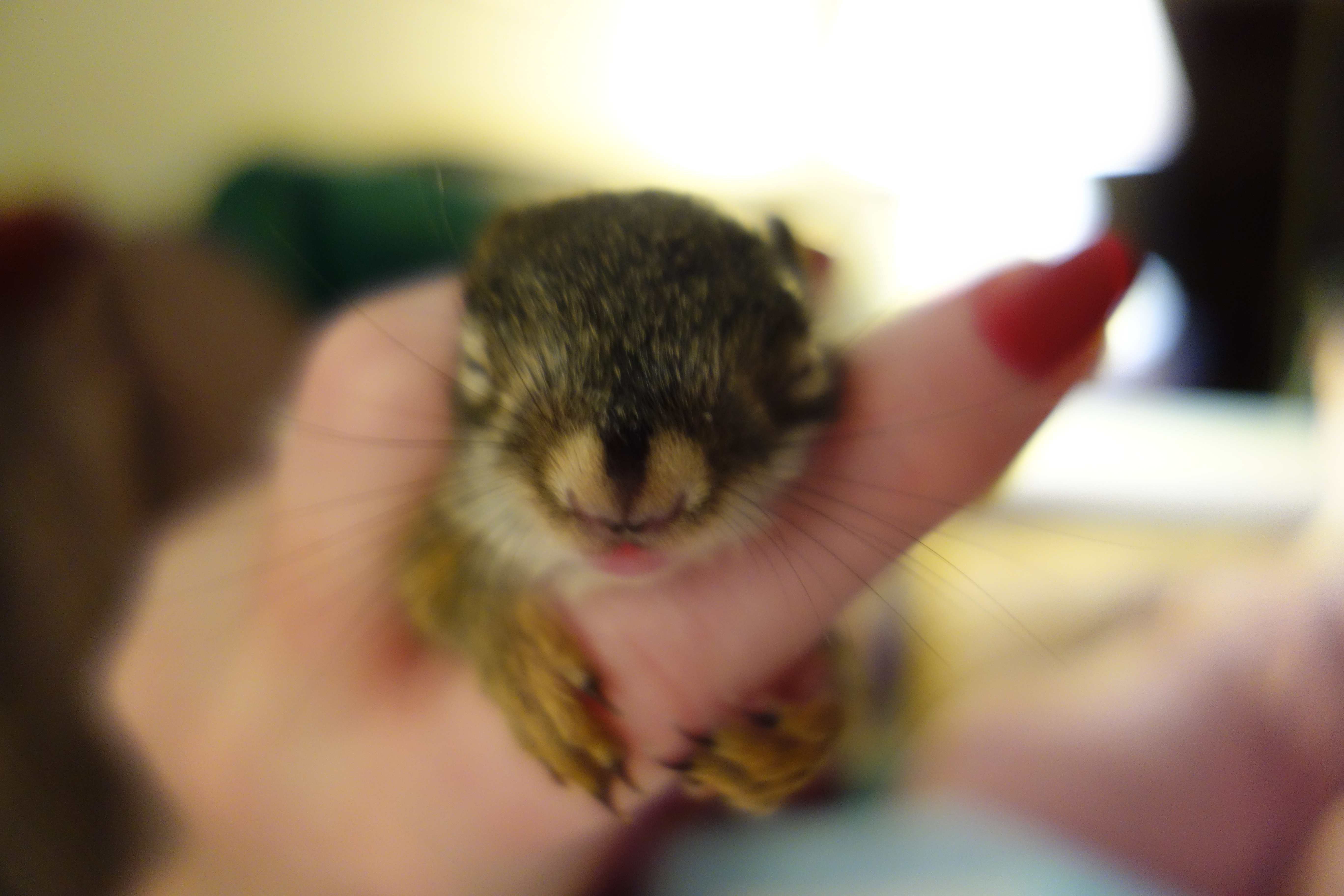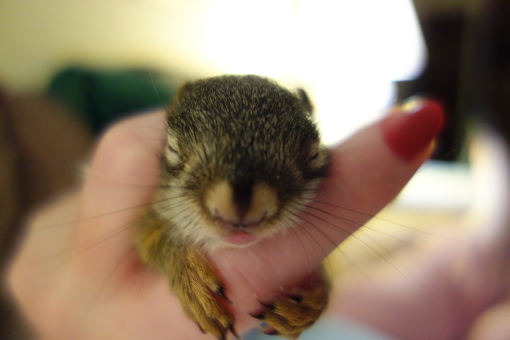 I received an urgent call from a neighbor about a nest of baby squirrels found in the remains of a chopped down tree. My advice: leave the babies covered and warm in the hopes of mommas return. (though secretly, I was hoping for the chance to raise a lot of baby squirrels;) The next day I got another call that they were still there – what to do? “I guess I can take them” I said to the lady who found them (hee hee).