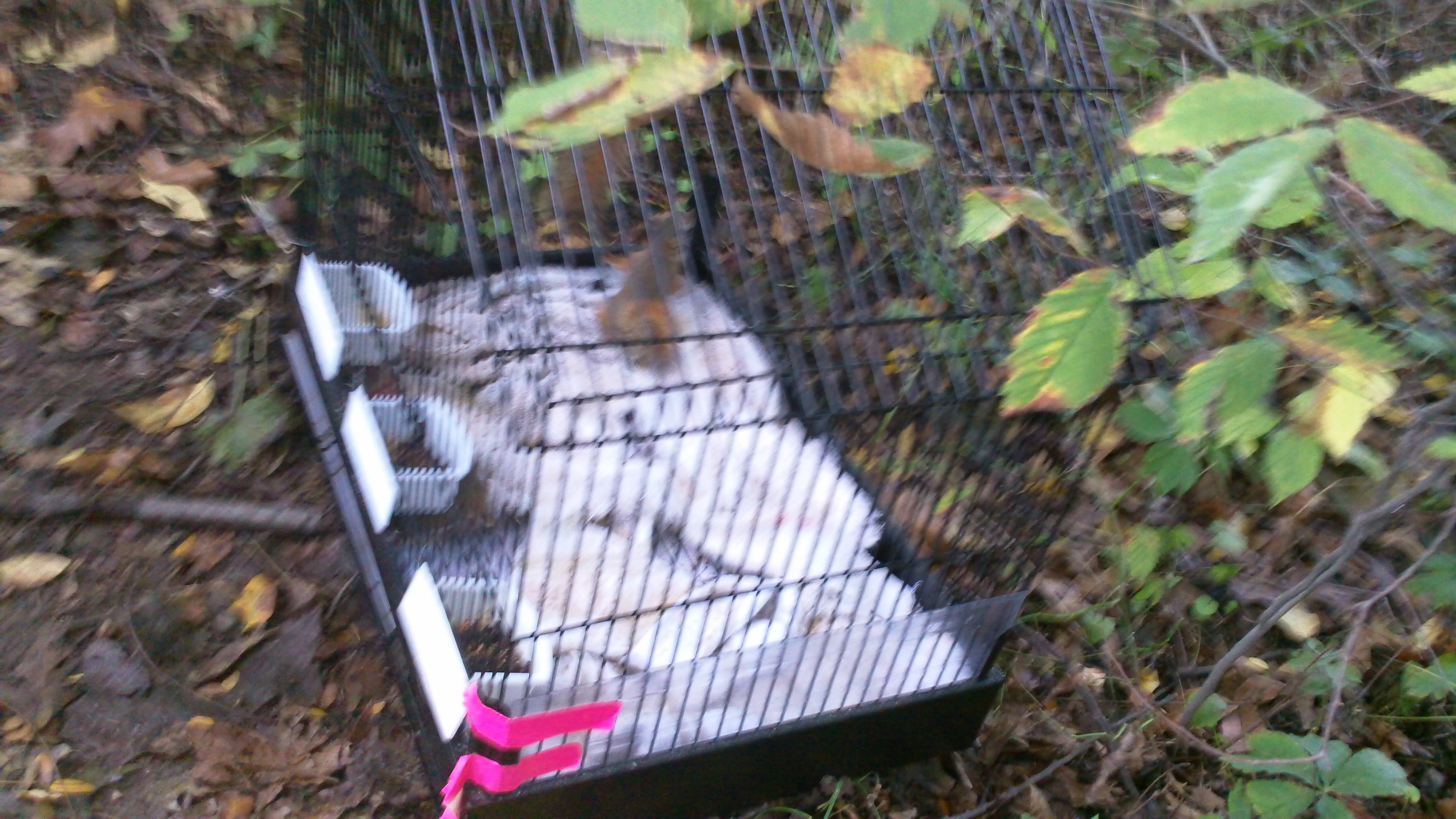 This is part of the story where I get accused of stealing a baby lol. I will tell you what happened and you can judge for yourself (though I DID NOT steal that baby!) Since the babies were safely blocked into the dog house by the trap, and my plan was to trap the momma, I didn’t see any harm in “borrowing” a baby for the night. I would simply bring her back the next day, reunite the family and let them all go in the woods together.