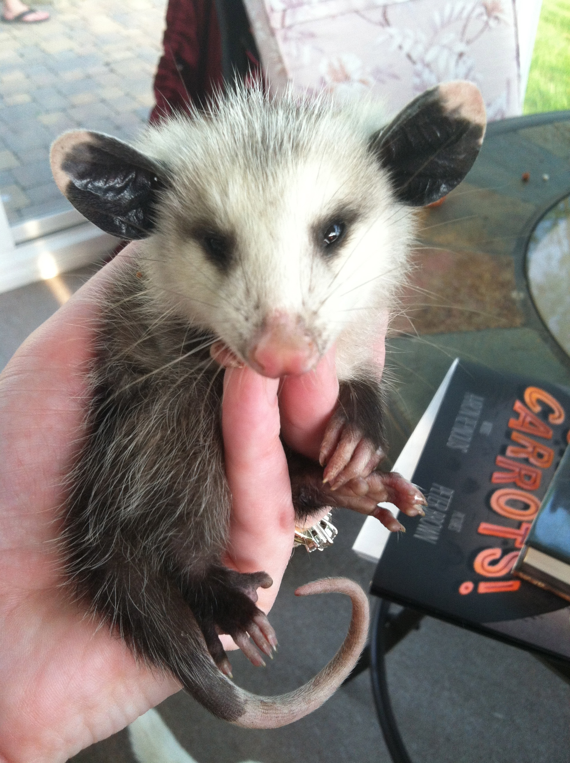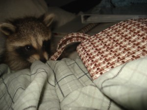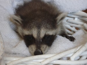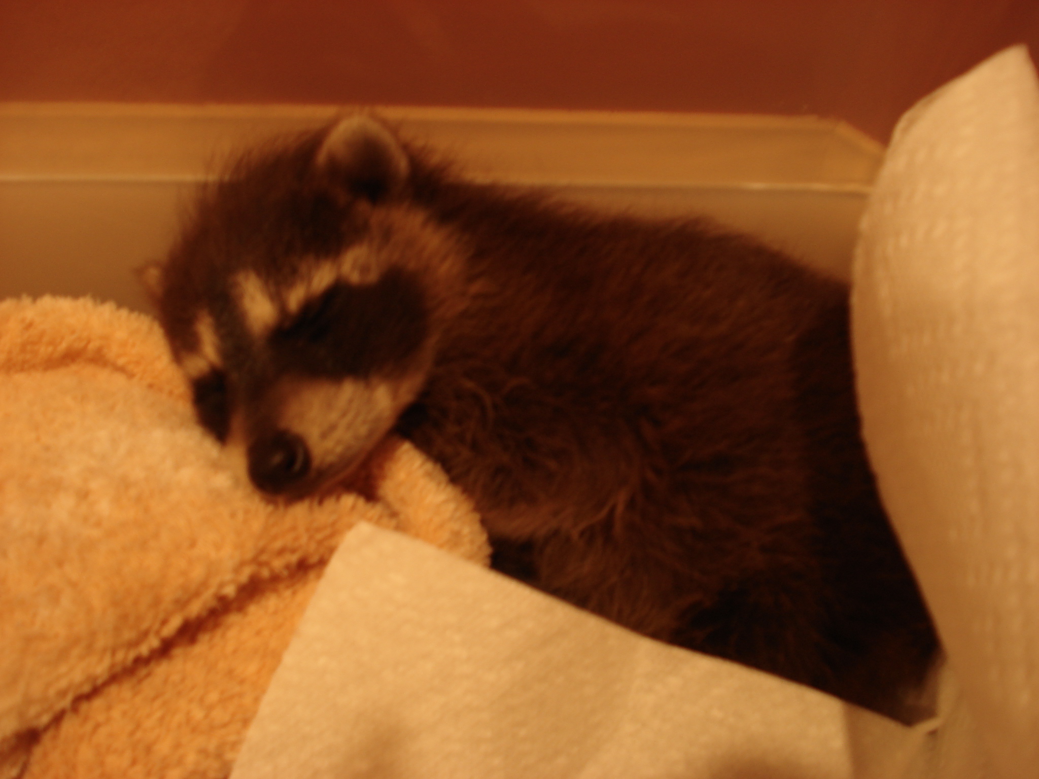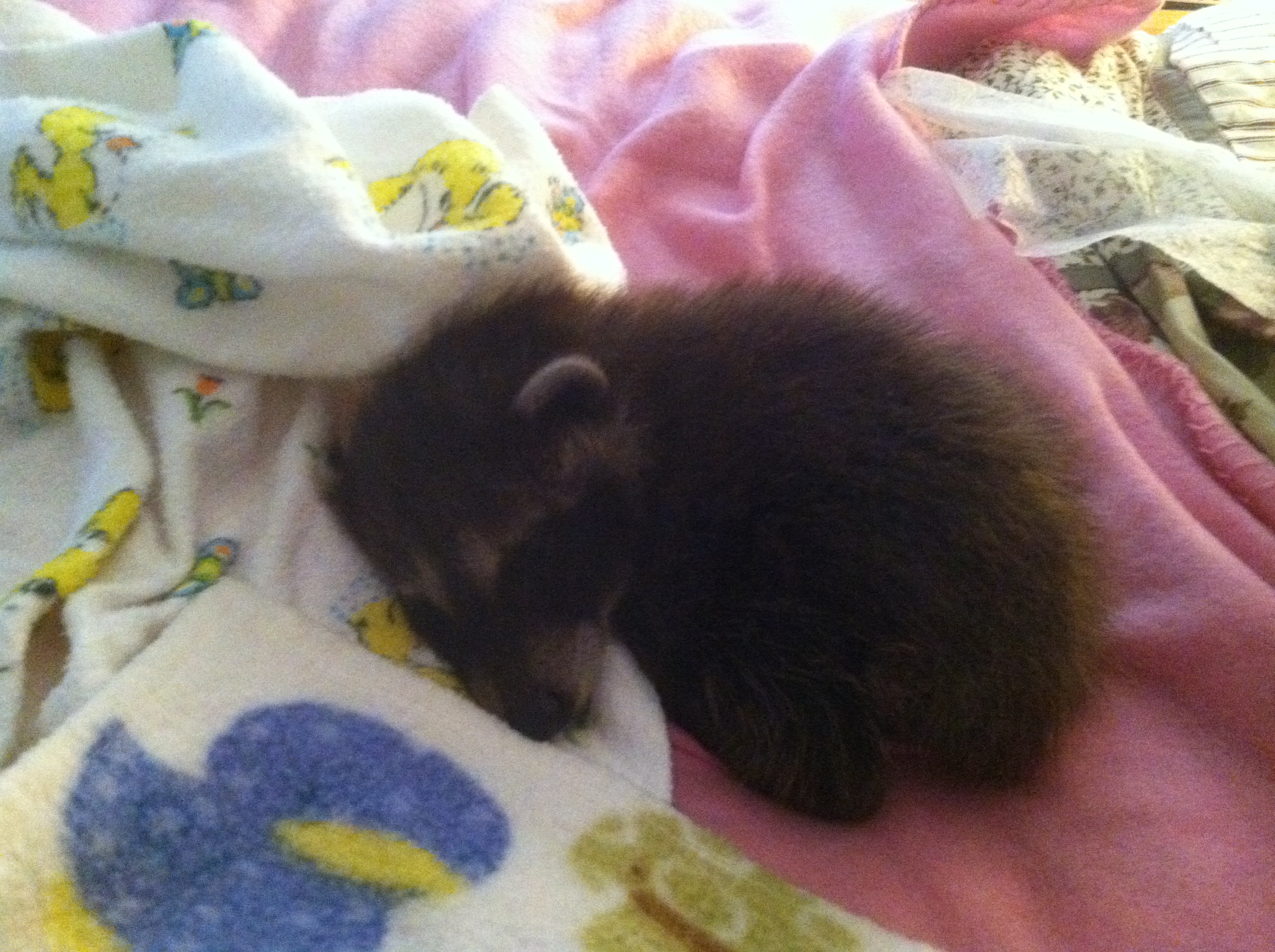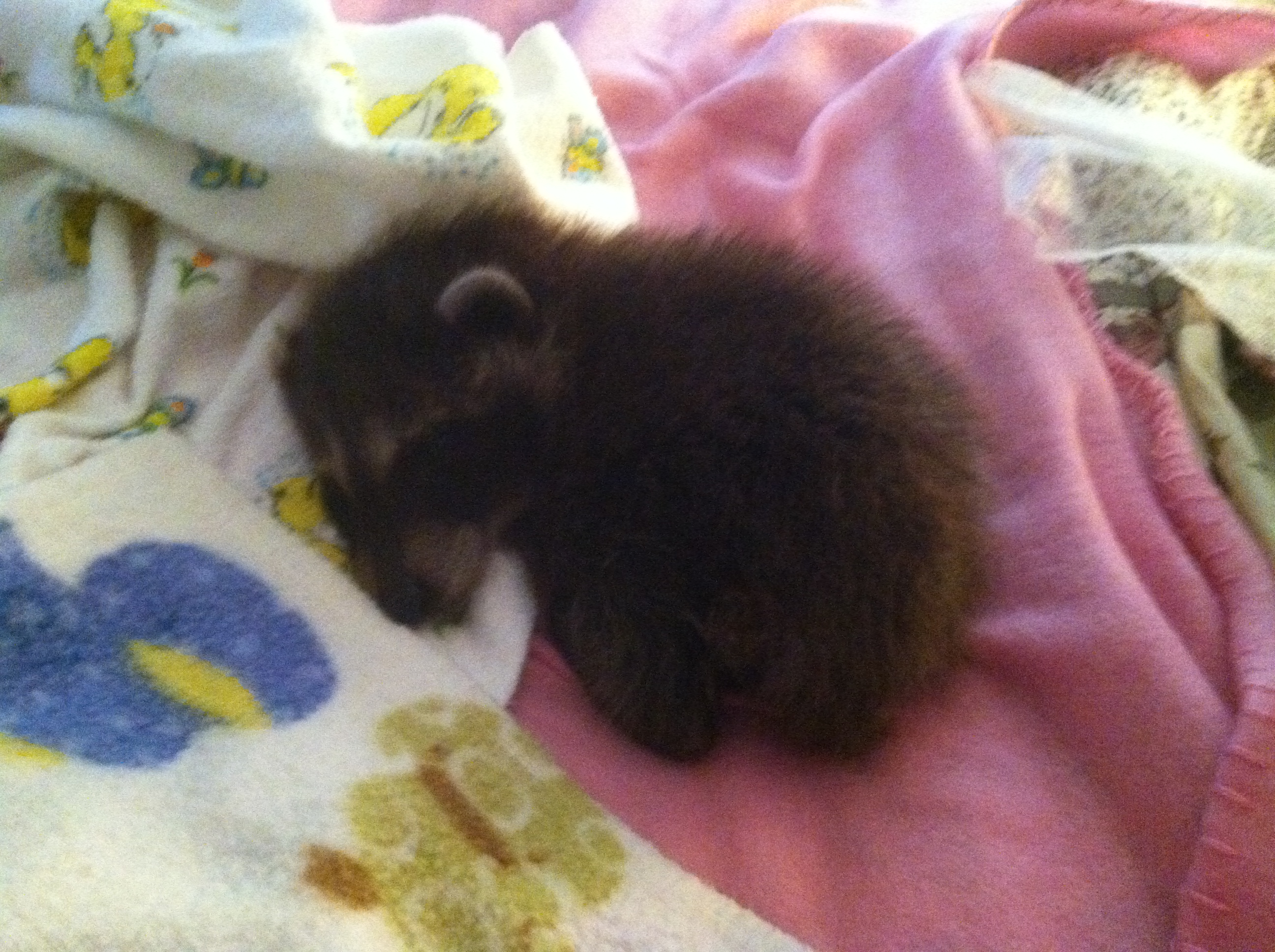 A strange thing happened on the Saturday just before Mothers’ Day. I got an email from someone in the neighborhood who found a baby raccoon on her back patio. This poor little girl had fallen two stories onto the concrete. Momma raccoon had made a nest for her babies in a portion of their attic that was inaccessible for us – no way to get the baby back to momma. I took the shocky little baby home with me and examined her for injuries. Shockingly, she seemed fine – just exhausted.