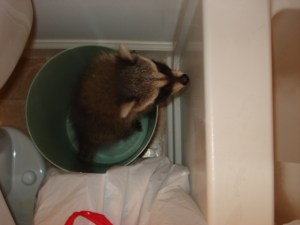 That was a good time. The raccoon kept hissing, thrashing and trying to bite my fingers as I climbed out into the closet. Then he decided that that was the moment he really needed to use the restroom. As I hoisted up the crate into the closet, a stream of poo and pee fell out onto my new carpet. I hustled to get him outside and that is when the REALLY bad idea hit me.