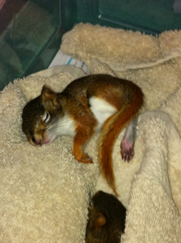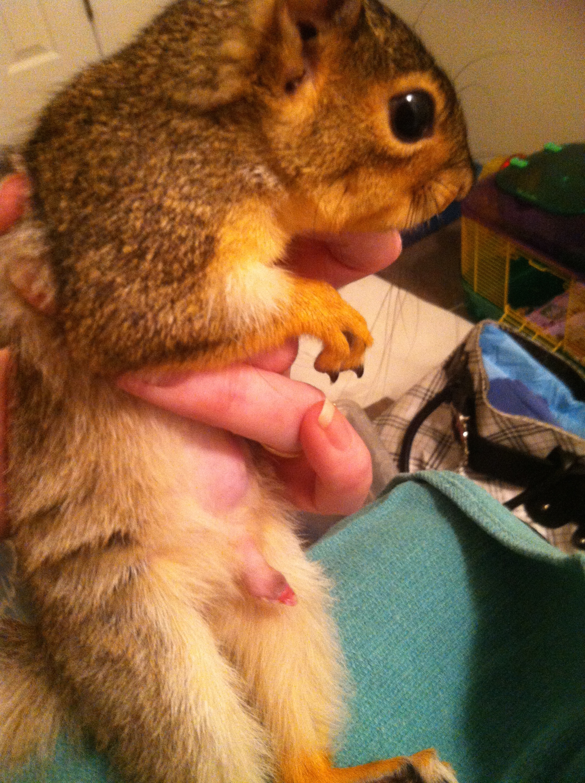 Poor Clint was set for release the day she contacted me, but unfortunately, she noticed he seemed lethargic and unable to urinate. After doing some research, I discovered that squirrels brought up on their own are far more likely to suffer traumatic injuries to their genital region due to excessive suckling. Permission to laugh now granted.