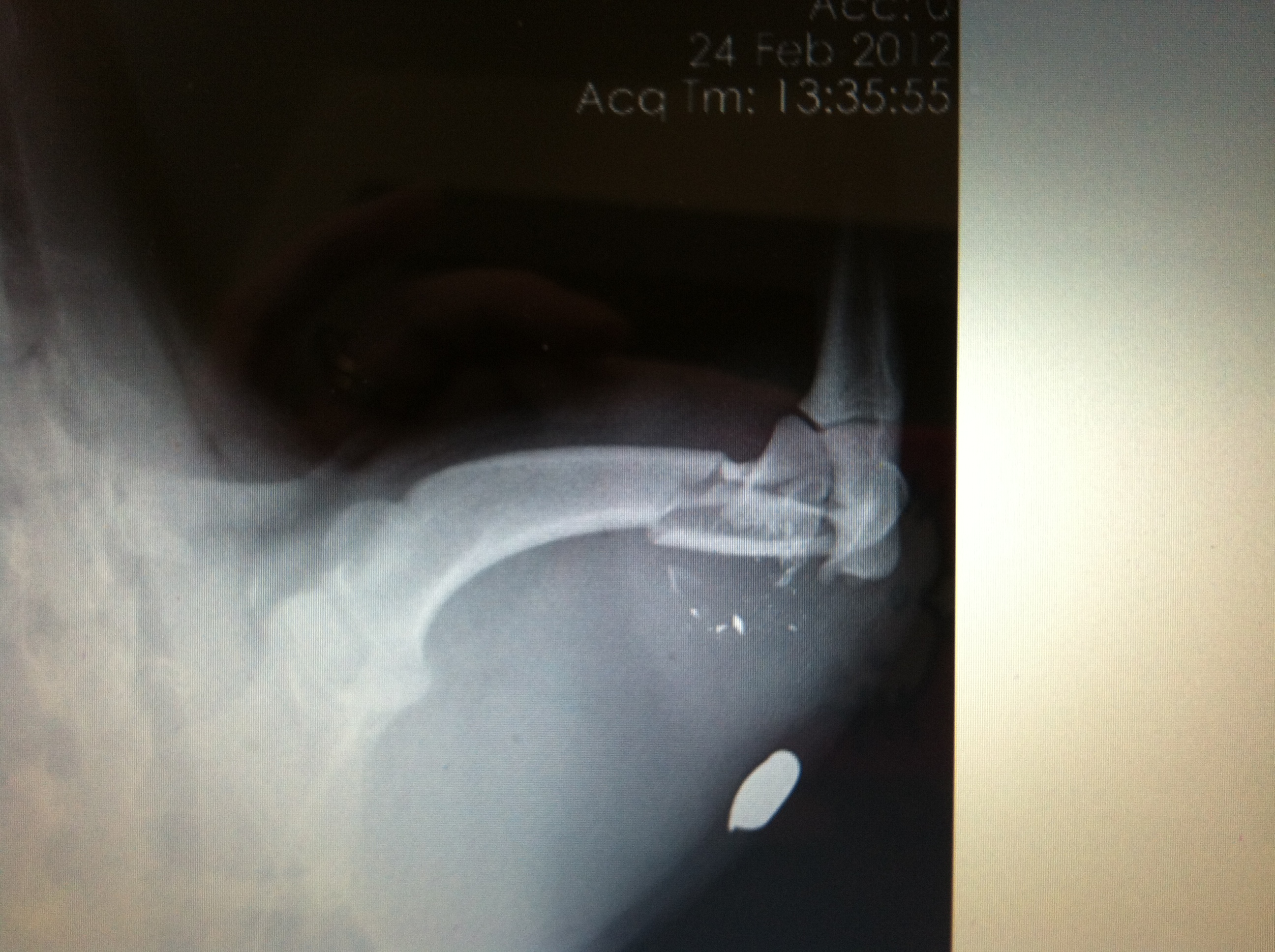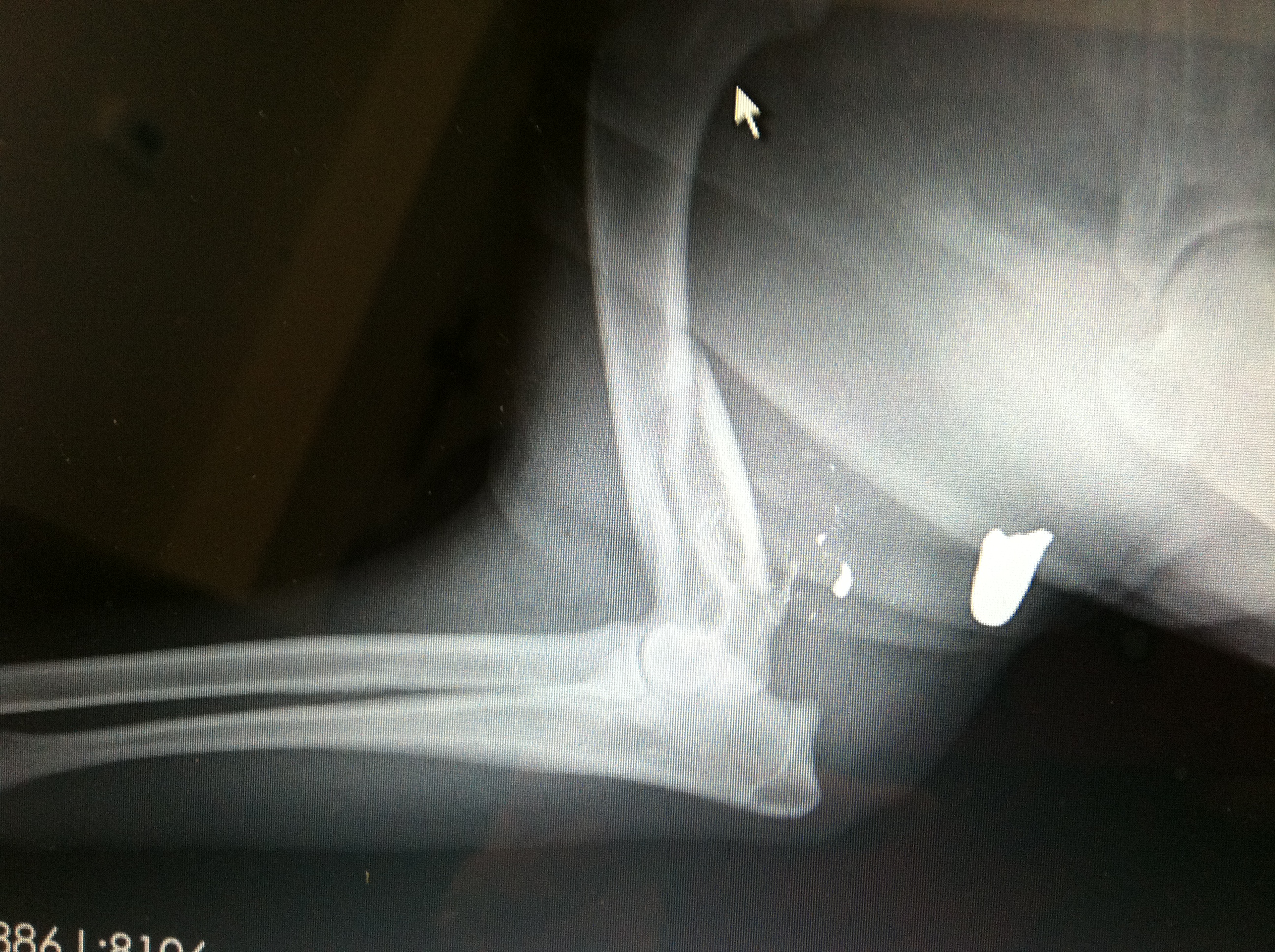 I have repaired a grand total of ONE fracture in my 18 year career (I usually send them to a specialist). so you can imagine that I was a bit stressed and fairly anxious for this procedure. As it turns out, I was able to get the bones realigned and stabilized the fragments with a pin. I can’t explain the immense relief I felt when I saw this x-ray of the pin seated just right!