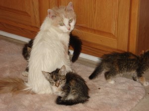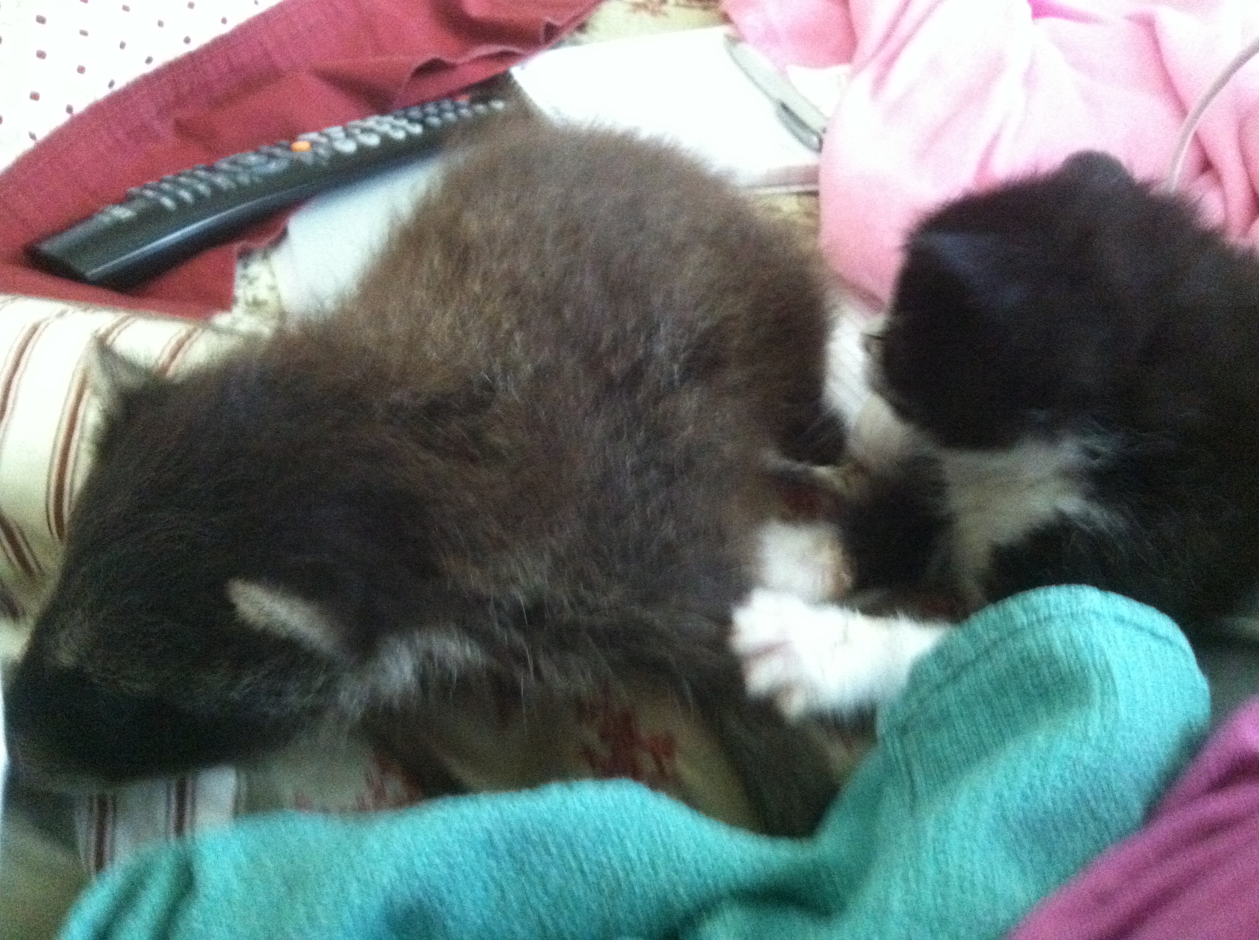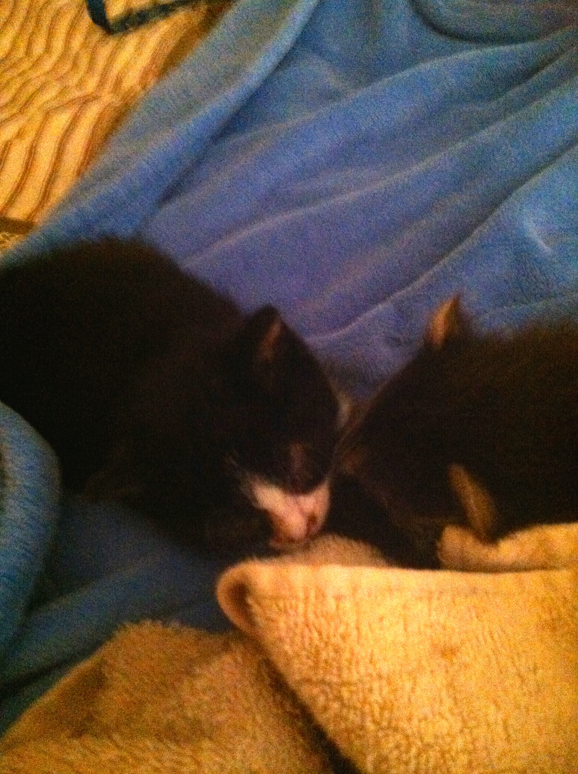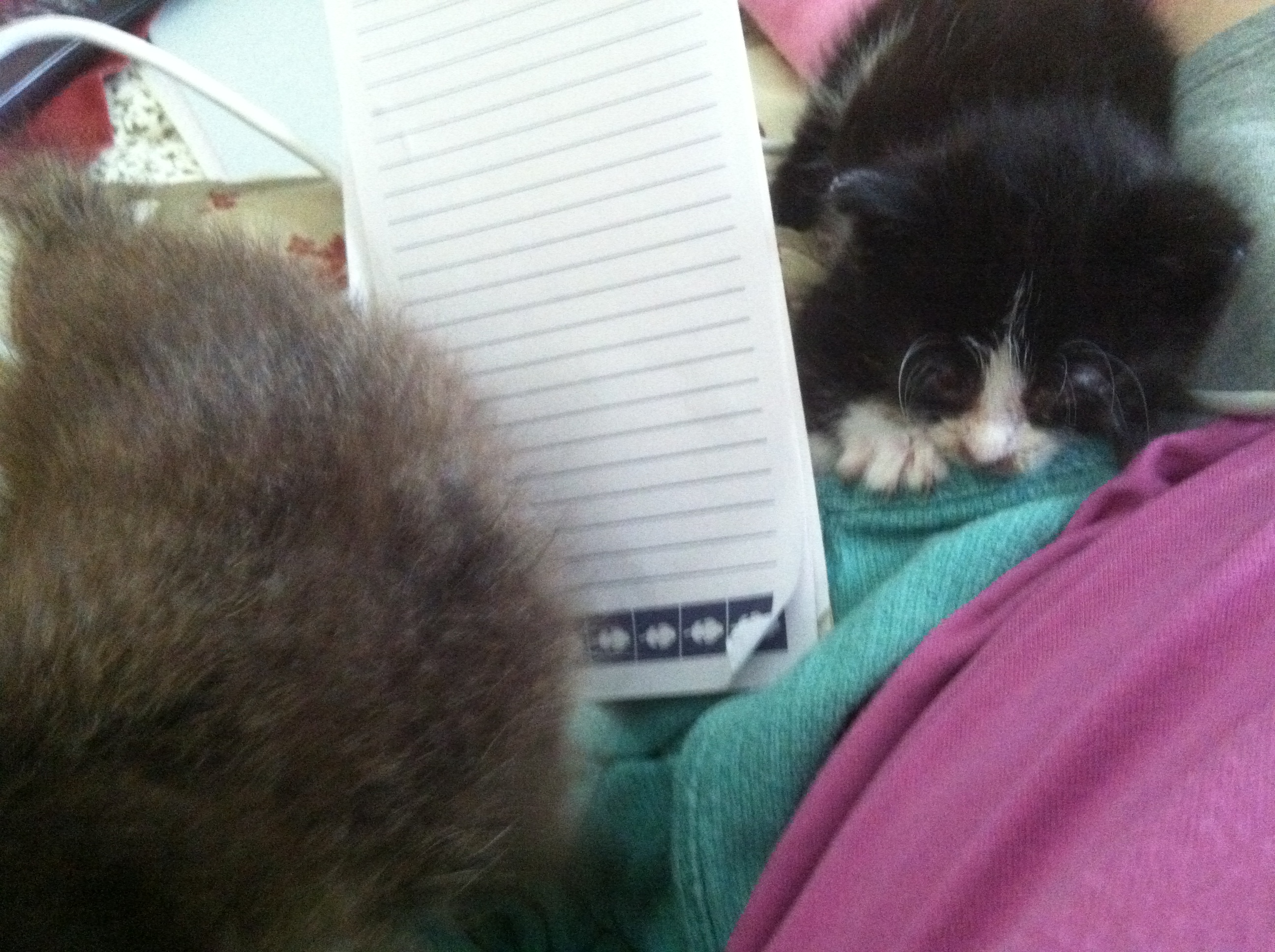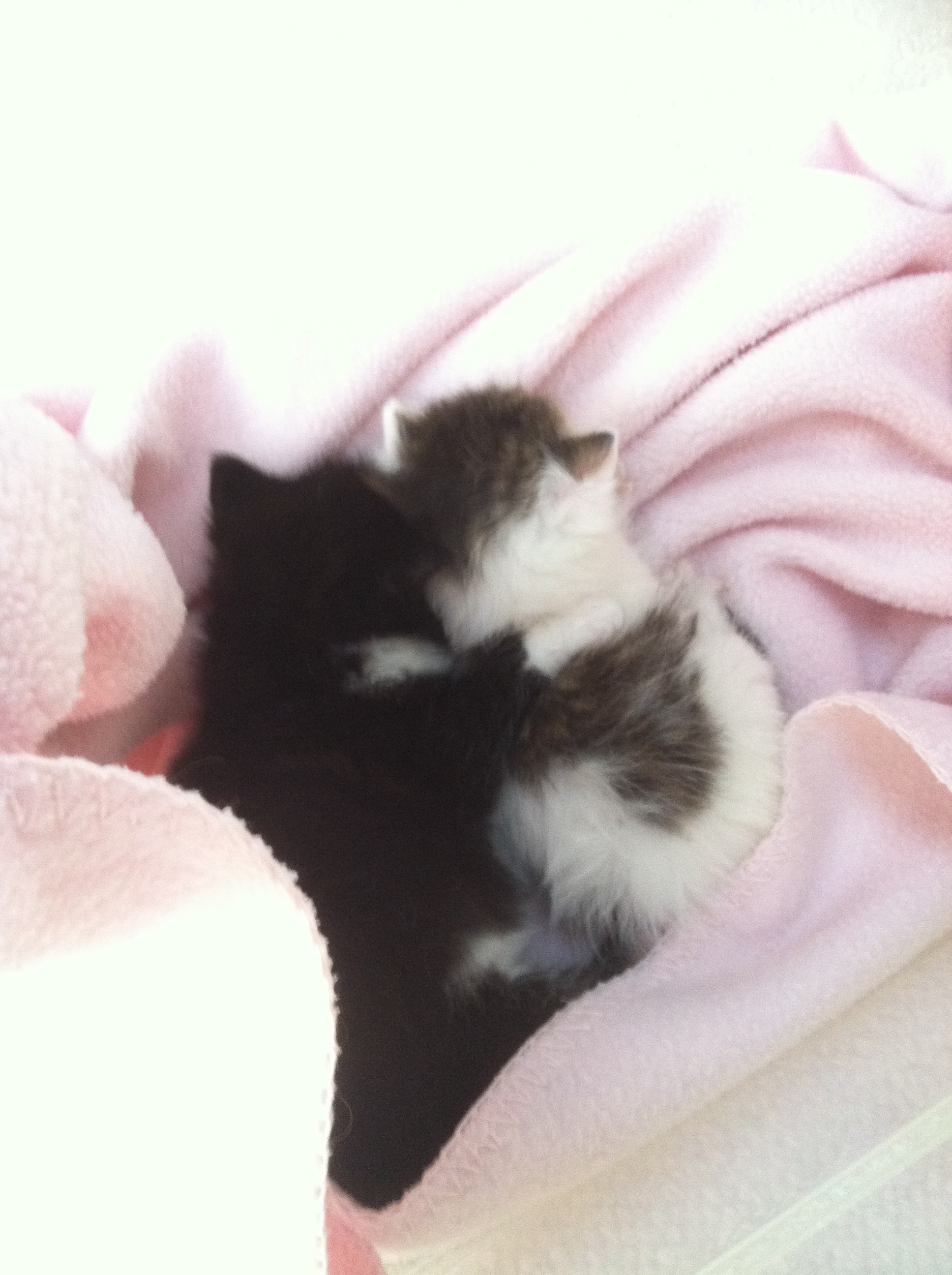This is a picture of the two kittens I began fostering back in April (2014). They were about 3 weeks old and VERY sick. The black and white baby “Cuddles” was eating some formula, but her little sister (half her size as you can see) had to be tube fed. These two girls spent most hours of everyday for the following three days at my side. The little one surprised me with her strength to hang on, but eventually (after 4 days) she couldn’t hold on anymore. It was early morning and I heard the most awful cry I had ever heard come from a kitten – that’s saying a lot considering I’ve been in the veterinary profession for 21 years now. I knew as soon as I heard the cry what was wrong – the little one was dying. Cuddles was experiencing extreme emotional distress that I have never before witnessed – my heart wrenched for her and I did my best to provide comfort.