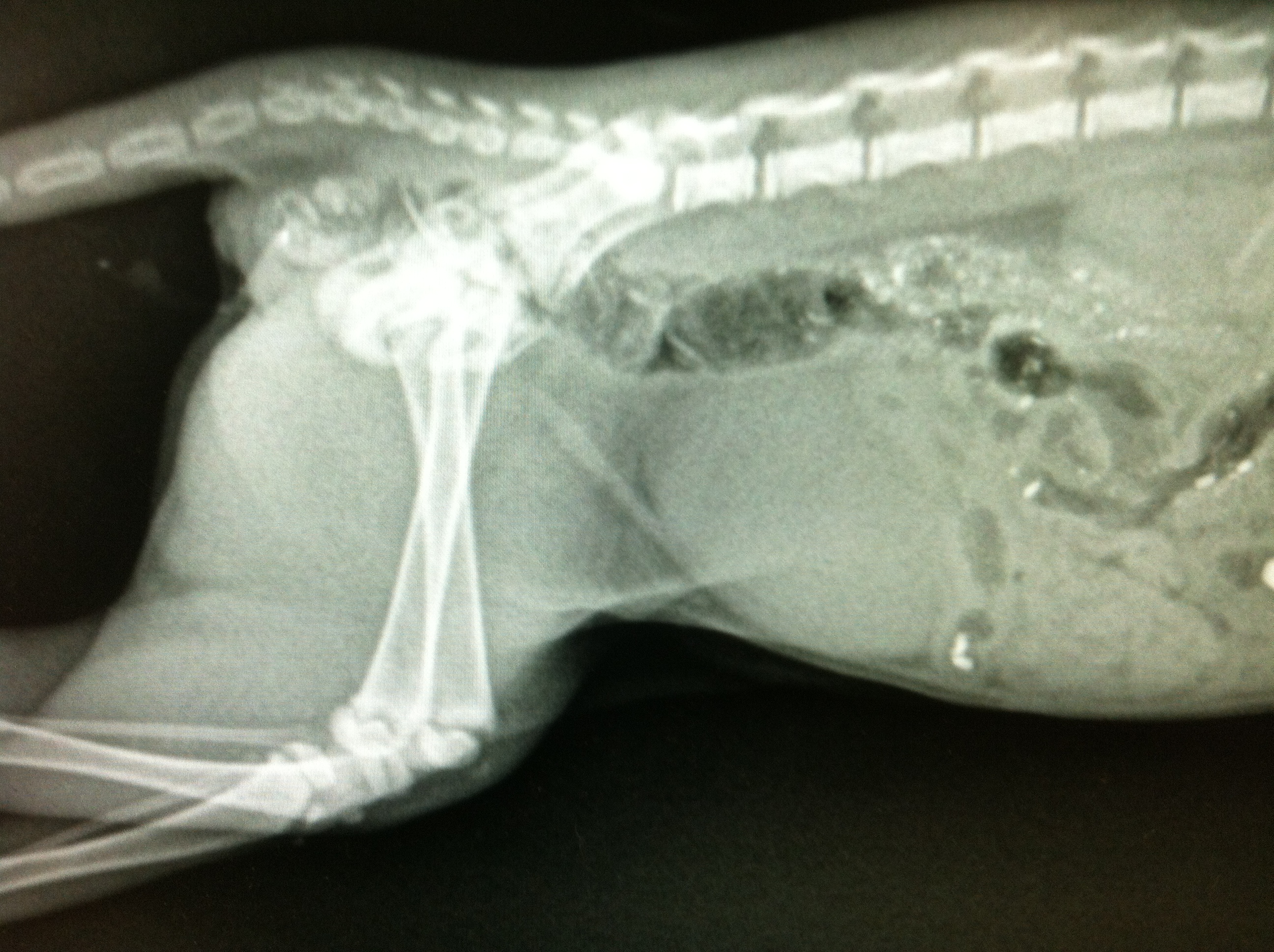 The only thing of significance on this x-ray is a growth plate injury (if I were more computer savvy I would put an arrow on it, but alas, I am not). Bone growth occurs at specific places (growth plates) in long bones, and damage to these areas can result in malformation of the limbs. Fixing this injury would require surgery. Since she was so tiny and just suffered a major injury, surgery needed to be put on hold.