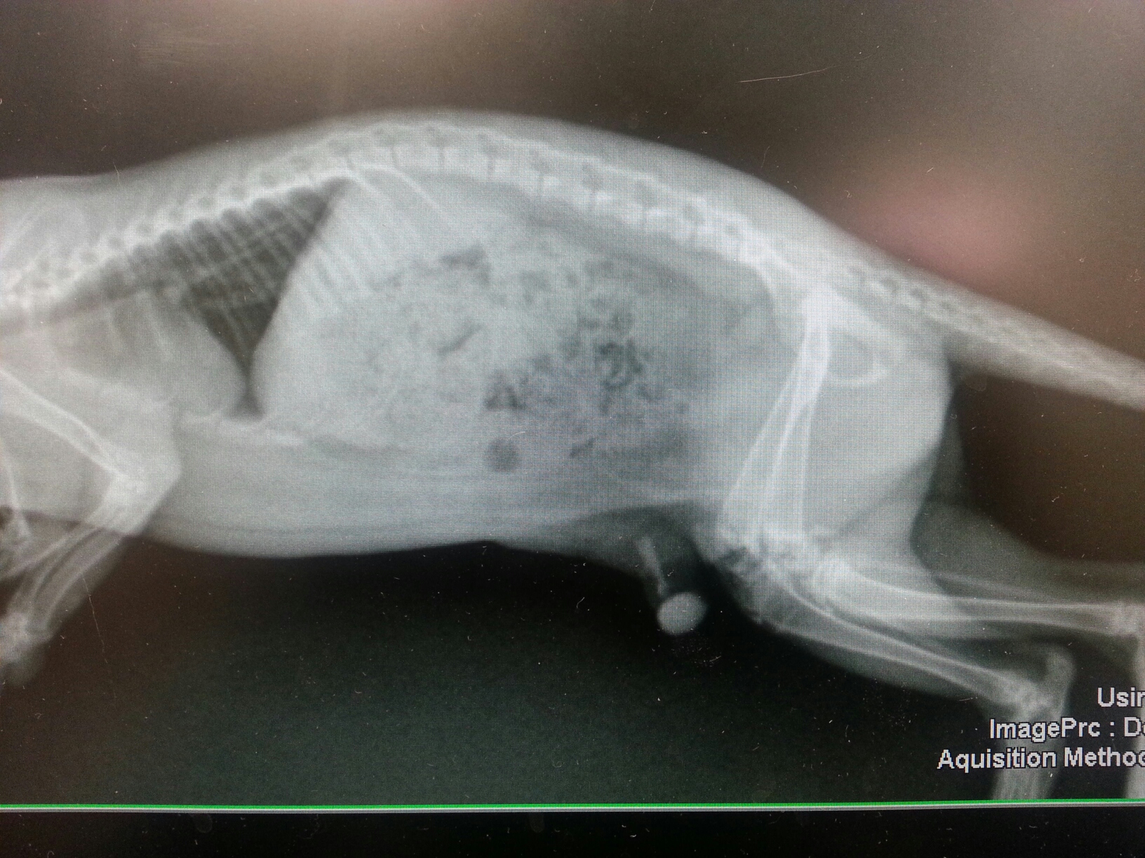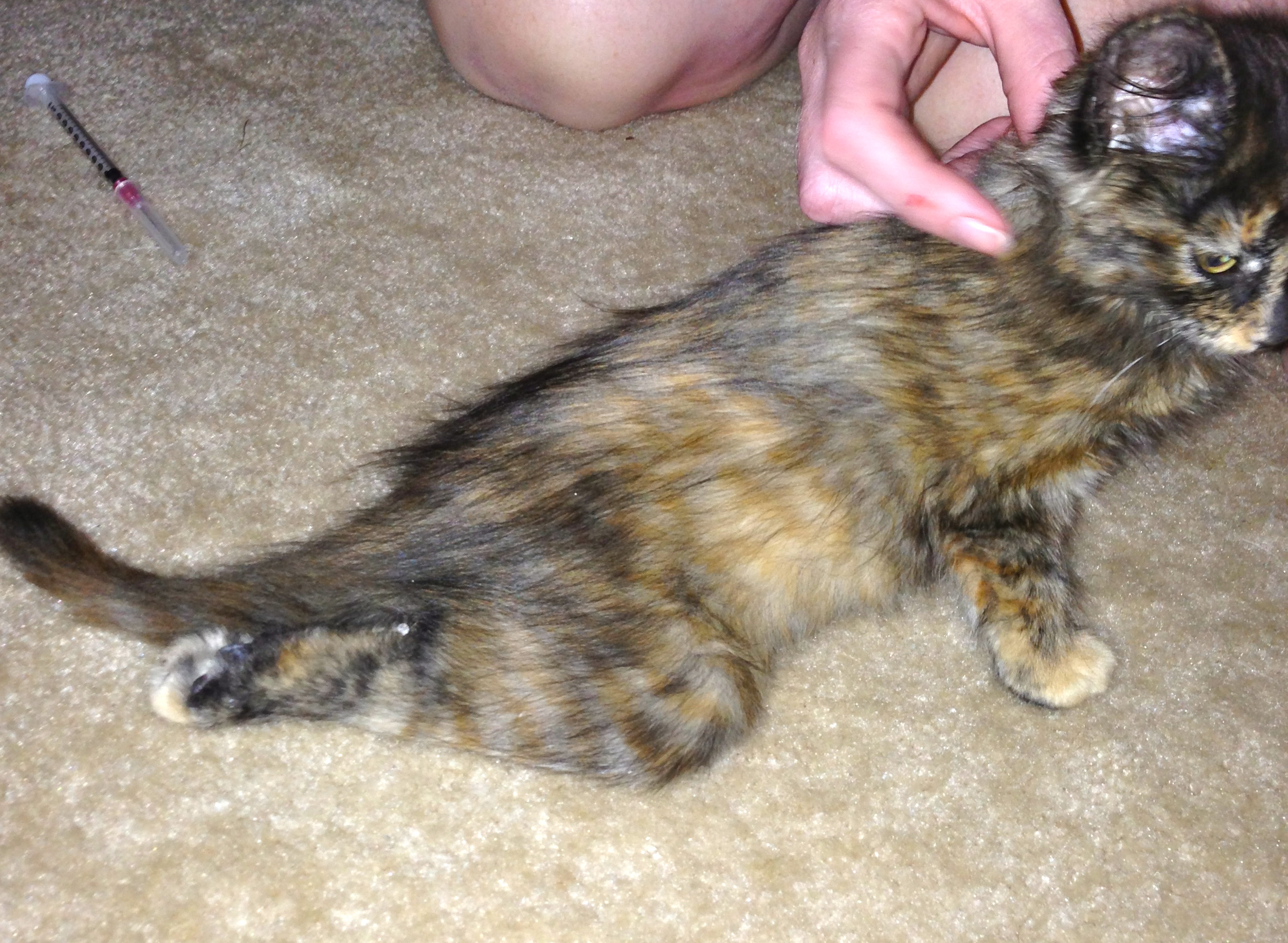 To my surprise, she was a very lucky kitten! (considering she was only 2 pounds and lived through such a trauma) She had no use of her back hind leg. I was expecting to find a bad fracture in her rear limb, but again, she surprised me: