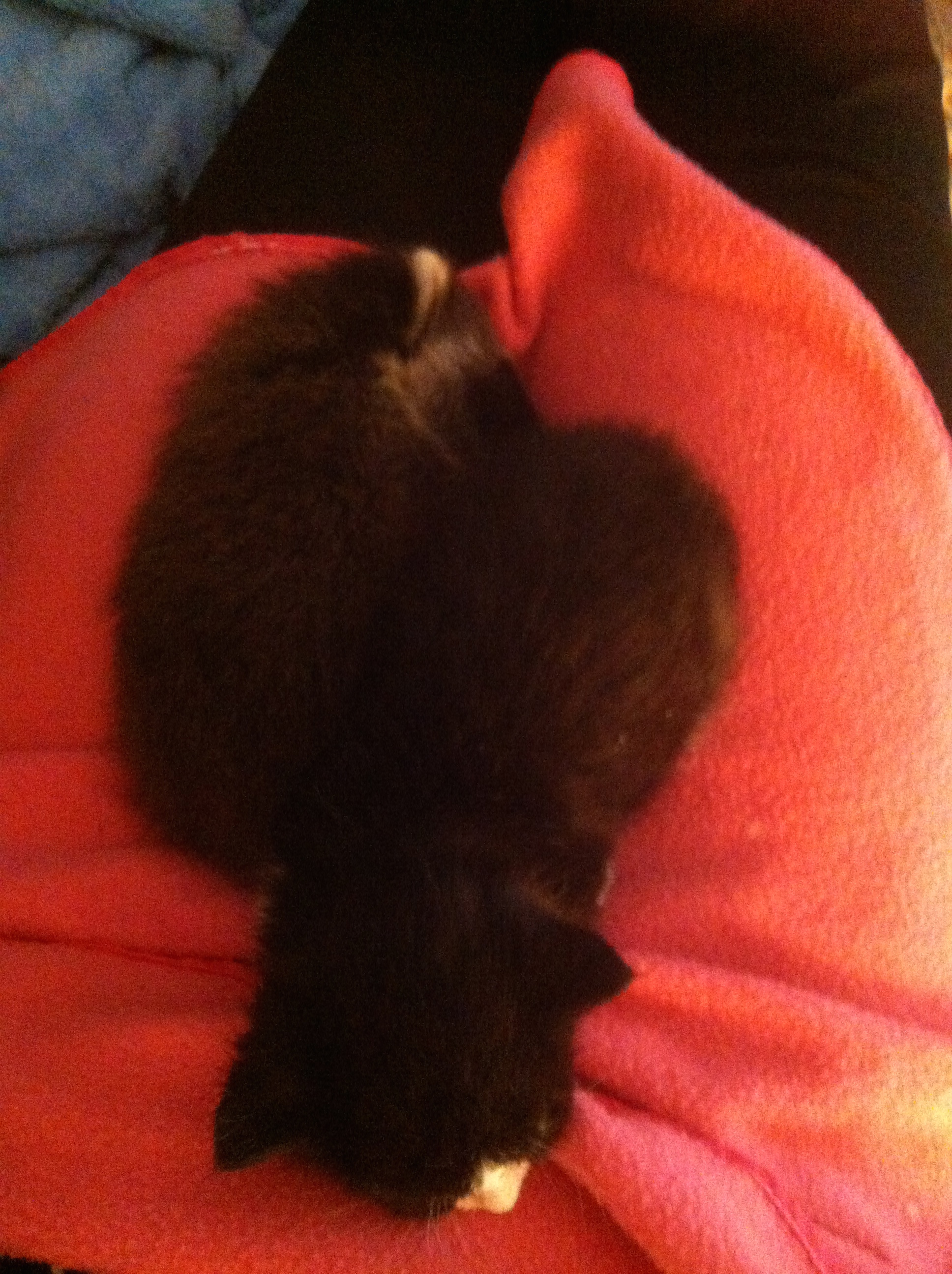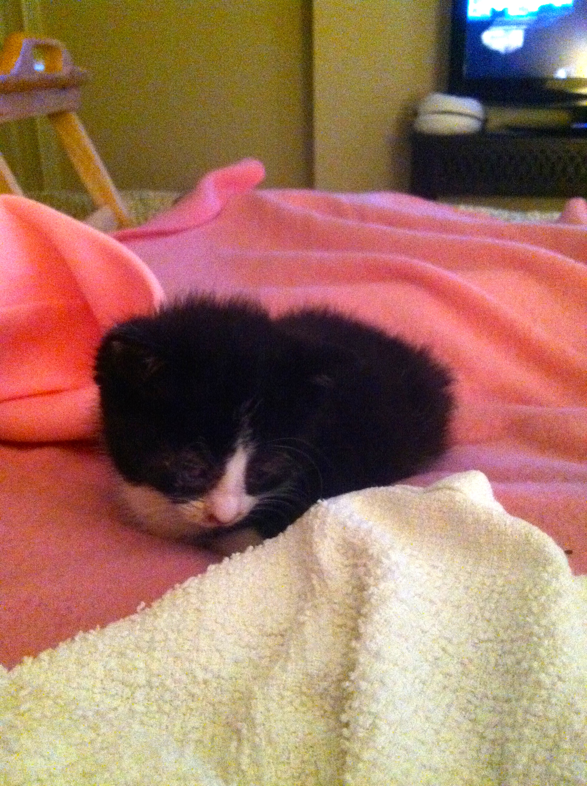 This is Super Suzzie the Wonder Kitten. She was laying in the middle of the road on a cold Sunday morning in October when I found her. I thought I was seeing a dead baby raccoon (and I felt a stab of sadness) as I drove past this brown puff of fur, but then a tiny head looked up at me! She was alive, but just barely.