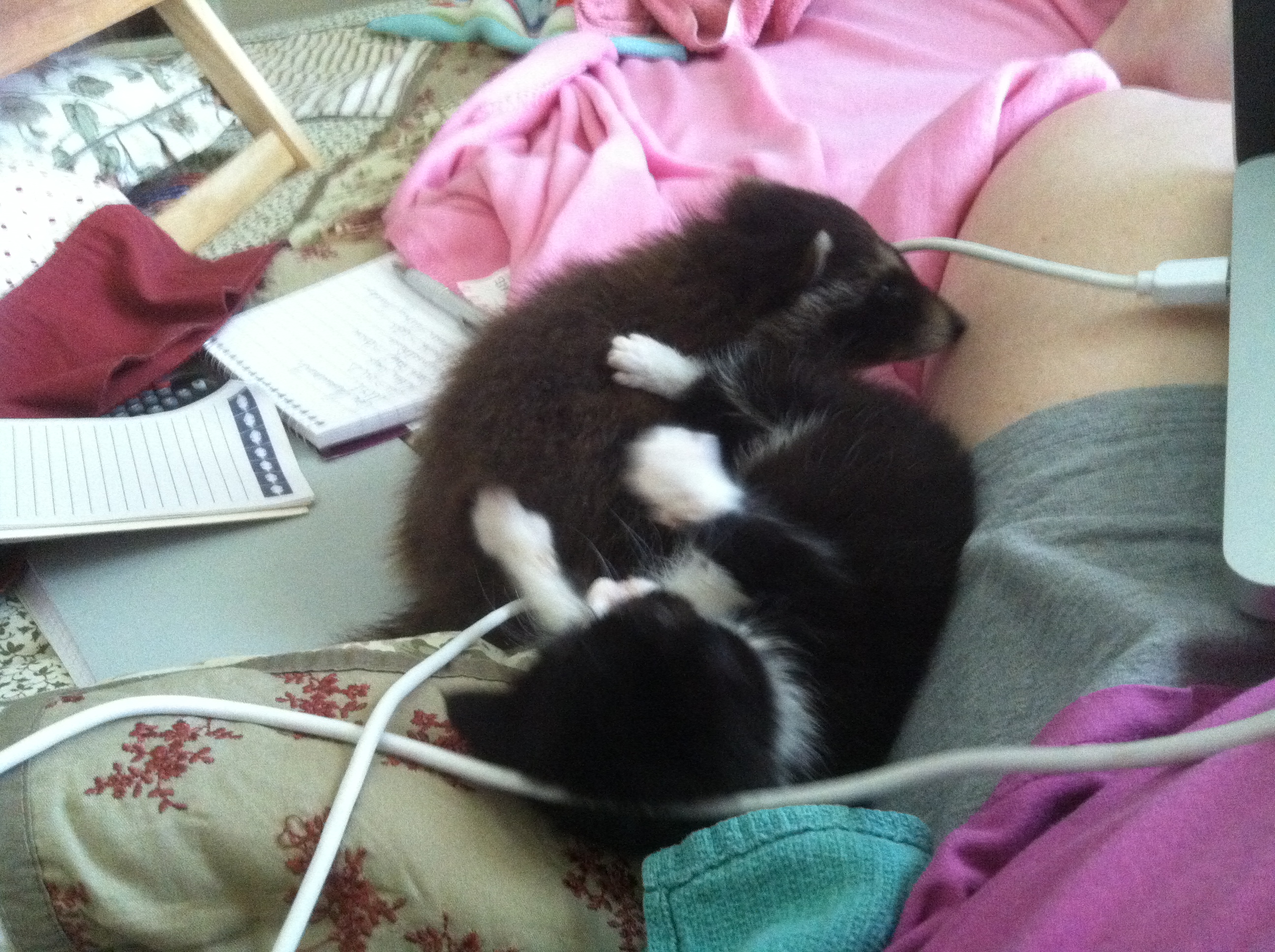 I will need to supply you with a little background information before I confess my bad idea: the previous summer I found two raccoon babies lying in the middle of cherry tree road. I made my husband drive back (he was insisting they were dead) and found them to be very much alive. I took them home and enjoyed my summer of raising two little raccoon babies! It was a great summer!