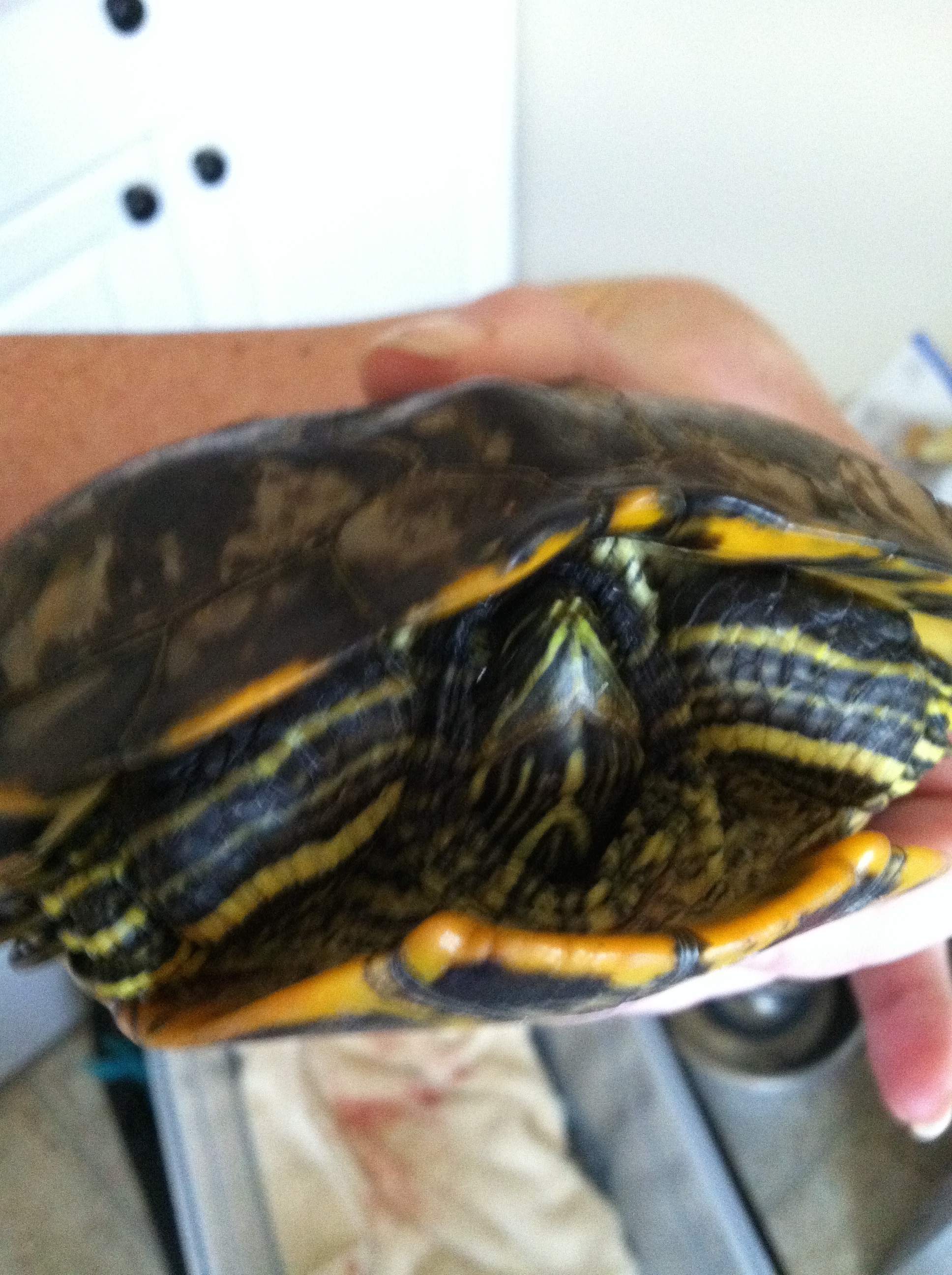 Fast forward to this summer – Monday July 27th. A friend of mine found a turtle in the road (most likely hit by a car) his shell was cracked and he was in pretty rough shape. The first thing I did was clean the wounds with sterile saline. I was mostly finished when he reacted strongly to a particular spot. I decided to give him pain meds before proceeding any further.
