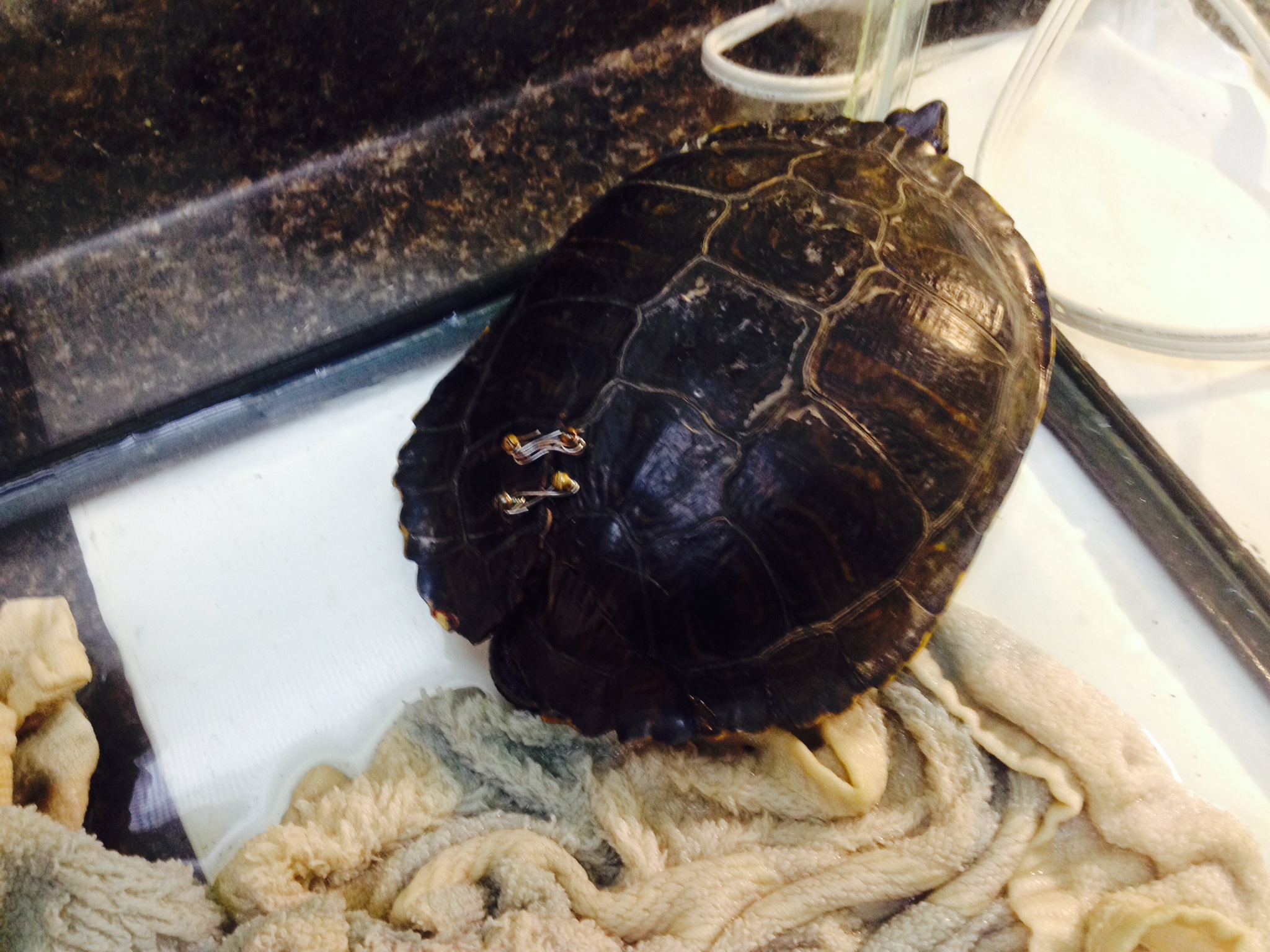 The next day he went to the avian and exotic animal specialist. She repaired his shell with screws and wire – pretty cool. I’m happy to say he is now in the very capable hands of Marty: Indianaturtlecare.com – the most wonderful turtle rehabber. She sent me a few photos of him and thankfully, all of her fingers are still intact.