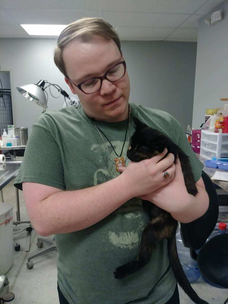 There is a very fun side story to Bobbi’s rescue and care. It is always a great experience when wildlife rehabbers get to meet and share ideas and stories. Several weeks ago, we got the SWEETEST tortishell cat in who sadly was born without eyes.